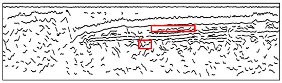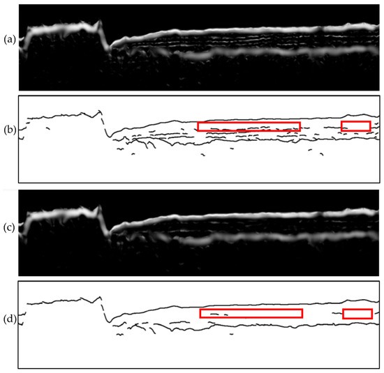The FrangiV method is a horizon picking method based on enhancement filtering and threshold picking algorithms [3]. The FrangiV method modified the traditional multi-scale filtering method proposed by Frangi by adding a vertical suppression term that can suppress false vertical structures on SBP images. We applied the FrangiV method to Figure 6a and picked horizons. During filtering, different sets of scale parameters were used, and different filtered results were obtained, as shown in Figure 13a,c. The scale parameters used in Figure 13a were smaller than those used in Figure 13c. The picked horizons in Figure 13b show more detailed horizons than the one shown in Figure 13d. The performances of both Figure 13b,d are poorer than Figure 7a, especially in the areas marked with red rectangles. Table 2 and Table 3 show the results comparing Figure 13c,d with the ground truth in Figure 7c. The proposed method achieved a higher F-measure value compared to the FrangiV method from Table 1, Table 2 and Table 3. Comparing Figure 13a with Figure 6c, more detailed horizons were displayed in Figure 6c, which indicates the effectiveness of diffusion filtering in the proposed method.