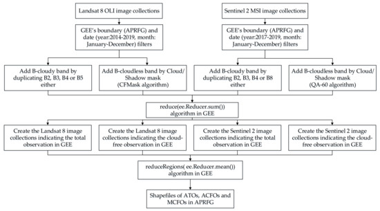Total and cloud-free observation maps are important for assessing the availability of Sentinel 2 and Landsat 8 data in APRFG. To create these maps, we analyzed the ATOs, ACFOs, and MCFOs of Sentinel 2 and Landsat 8. The process of calculating the ATOs, ACFOs, and MCFOs was implemented as shown in Figure 2. First, a customized binary band “B-cloudy” with a single value of ‘1′ was created by duplicating any one of the existing bands to compute the total observations over the APRFG study area. This binary band was generated for all Sentinel 2 and Landsat 8 imagery collections. Additionally, another customized band, labeled ‘B-cloudless’ with single value of ‘1′, was added to all satellite imagery collections to indicate the number of cloud-free observations. This band was created by using the QA60-based cloud-mask operation of Sentinel 2 and the CFMask of Landsat 8 data [38,39,40]. For Sentinel 2, the QA60 band contains information on whether the pixel is cloudy or not in 10th and 11th bit for opaque and cirrus clouds. For Landsat 8, the CFMask is a multi-pass algorithm that creates a cloud shadow mask by iteratively estimating cloud heights and projecting them onto the ground. Second, annual and monthly total and cloud-free observation maps were created by using a ‘reduce (ee.Reducer.sum())’ algorithm. Finally, the ATOs, ACFOs, and MCFOs were calculated and combined with an APRFG shapefile by using the ‘.reduceRegions’ algorithm with ‘ee.Reducer.mean()’ reducer in the GEE environment. Through the above-mentioned steps, the shapefiles describing the total and cloud-free observations for each rice field in APRFG can be obtained.