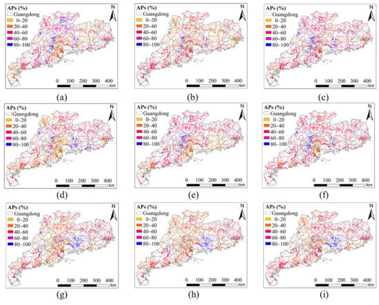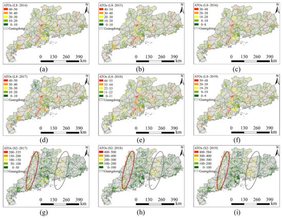 The APs distribution of ACFOs over APRFG: (a–f) the APs distribution of Landsat 8 from 2014 to 2019, (g–i) the APs distribution of Sentinel 2 from 2017 to 2019.