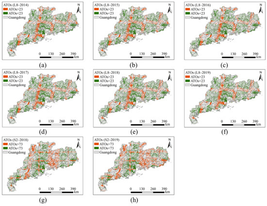 The regions whose ATOs were greater than the mean annual total observations (MATOs) in APRFG: (a–f) represented the ATOs (>23) of Landsat 8 from 2014 to 2019; (g–h) represented the ATOs (>73) of Sentinel 2 (2A + 2B) from 2018 to 2019.