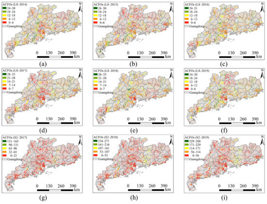 ACFOs of Landsat 8 (L8 2014–2019; a–f) and Sentinel 2 (S2 2017–2019; g–i) over APRFG.