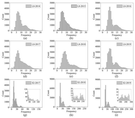 The frequency histogram of ACFOs of Landsat 8 in 2014–2019 (a–f) and Sentinel 2 in 2017–2019 (g–i) over the APRFG. Note: (g) showed the results of Sentinel 2 in 2017, in which the total count was less than in 2018–2019 as Sentinel 2B images were only first available in August 2017.