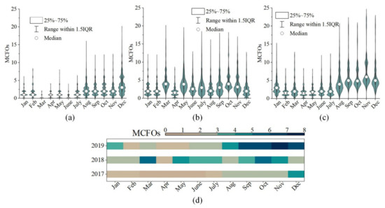 MCFOs of Sentinel 2 over the APRFG from 2017–2019: (a–c) the box plot and (d) the hot plot of the MCFOs. Note that there are no observations of Sentinel 2B before August 2017.