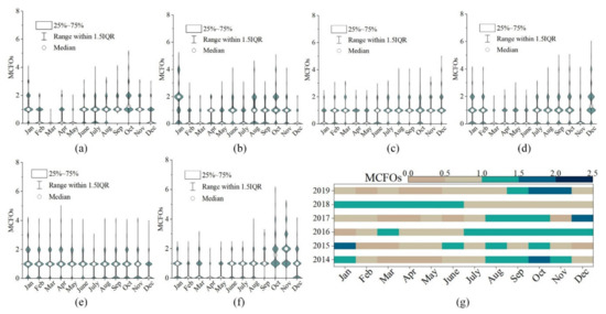 MCFOs of Landsat 8 over the APRFG from 2014 to 2019: (a–f) the box plot and (g) the hot plot of the MCFOs.