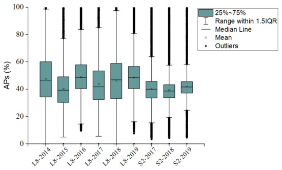 The ACFOs and MACOs of Sentinel 2 and Landsat 8 showed cloudy frequency among all the paddy rice fields in Guangdong; however, the former statistics reflected only the cloud-free number of Sentinel 2- and Landsat 8-acquired imagery. In fact, redundant repeat observations of the numerous adjacent satellite images, which provided the same spectral information, are available for most areas of the APRFG in a single day. For rice monitoring, the time-series remotely sensed data is useful for the VIs inversion and therefore, the APs of ACFOs is paramount and indeed meaningful for observing the rice growth. The APs of Landsat 8 and Sentinel 2 shown in Figure 9 vary with position, time, and sensors. Moreover, it can be seen in Figure 10 that the median line and the mean of APs both of Landsat 8 and Sentinel 2 were less than 50%, in spite of some outliers. Table 3 describes the annual mean and median of APs of Landsat 8 and Sentinel 2. In detail, the mean APs of Landsat 8 were less than 52.1% and that of Sentinel 2 were less than 47.7%. Although the ACFOs and MCFOs reported above for Landsat 8 were smaller than those for Sentinel 2 due to the inherent revisit cycle, the APs for Landsat 8 were larger overall than those for Sentinel 2. Therefore, the APs provided an accurate description of the limited availability of ACFOs of Landsat 8 and Sentinel 2 over the AFRFG.