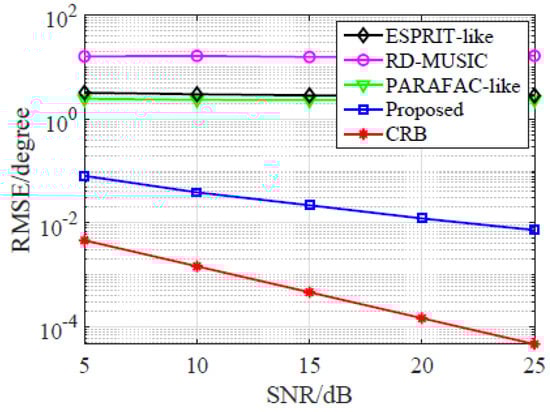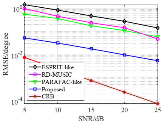 Thirdly, we repeat the above simulation in Case II, and the result is shown in Figure 4. It is clearly observed that all the RMSE improve once SNR increases. Compared with ESPRIT-like, RD-MUSIC, and PARAFAC-like, the RMSE of the proposed estimator is about 10 dB lower. The observation may be caused by two reasons. On the one hand, the estimation accuracy of MUSIC is related to its search grid while ESPRIT-like suffers from the inaccurate GPE error matrices estimation. On the other hand, the eigen decomposition in both MUSIC and ESPRIT cannot exploit the tensor nature, leading to degraded subspace estimation. Notably, the proposed estimator always provides the lowest RMSE, which proves that the proposed estimator is superior to all comparison algorithms. However, it should be pointed out, as illustrated in Figure 2 and Figure 4, the distance between the proposed approach and CRB is big, so there is much room for further improvement.
