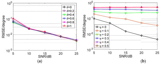 (a) Average RMSE vs. SNR with various gain error range δ, and (b) Average RMSE vs. SNR with various phase error range η.