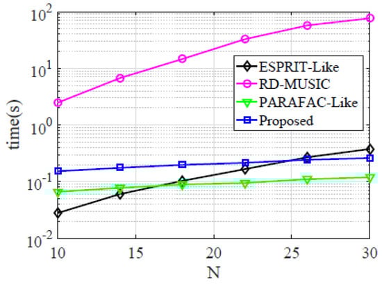 Finally, the average run time of different algorithms versus N is given. In this experiment, M = 21, SNR = 15 dB, snapshot L = 500, gain errors, and phase errors are randomly chosen from [0.5,1.5] and ±0.1, respectively. It can be found in Figure 5 that the run time that RD-MUSIC required is at least 10 dB higher than the proposed estimator. Besides, the run time of our estimator is similar to that of PARAFAC-like (the gap is smaller than 5 dB), and the proposed estimator is more efficient than ESPRIT-like for large scale array.