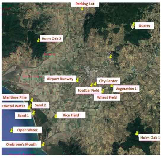 Our experiments focus on four images concerning the same scene and are collected at different times with different acquisition conditions. The scene includes several application scenarios such as urban, rural, and coastal regions and is a good test case for the proposed analysis. The scene has a spatial extent of and is centered near the city of Grosseto, in the south of Tuscany, Italy. In Figure 1 we show a high spatial resolution image of the region of interest taken by Google Earth. In the same image, we have marked the position of some “targets” that will be adopted to discuss the results. Selected targets include both natural surfaces and artificial surfaces.