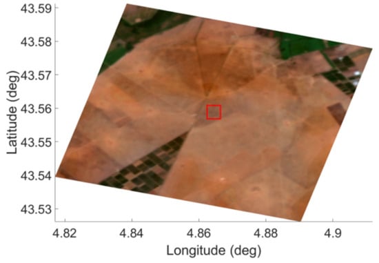 RGB representation of a portion of the PRISMA image on the La Crau site. The red box indicates the area including the measurement field.