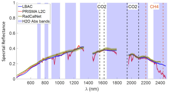 Several conclusions can be drawn from the results in Figure 5a–d. We can see that the general behavior of the spectra derived by the two AC algorithms is quite similar, and, in both the cases, the main absorption effects due to water vapor, CO2 and CH4 are substantially compensated. The LBAC reflectance’s are smoother than those obtained by the AC PRISMA algorithm.