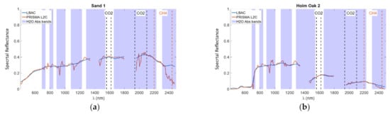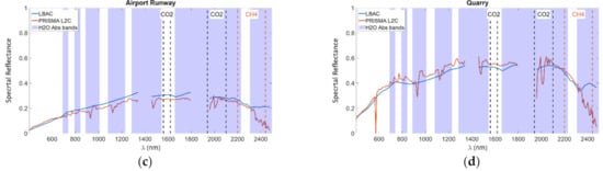 We start this sub-section by discussing the results concerning the DAY4 image and, specifically, four targets corresponding to both natural and artificial surfaces. As to the natural surfaces, we consider two pixels belonging to a beach (Sand 1) and to a holm oak forest (Holm Oak 2), respectively. The artificial surface pixels are selected from the airport runway (Airport Runway) and the rock quarry (Quarry), in the upper right part of the image. Figure 5a–d graphically compare, for each target, the spectral reflectance obtained by the LBAC (blue plot) with the L2C PRISMA product (red plot).
