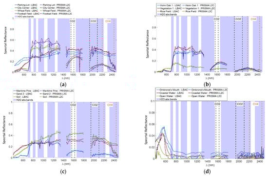 DAY4. Graphical comparison of the spectral reflectance obtained by the LBAC and the PRISMA L2C product for the targets: (a) Parking Lot, City Center, Wheat Field and Football Field; (b) Holm Oak 1, Vegetation 1, and Rice Field; (c) Maritime Pine, Sand2, and Soil, (d) Ombrone’s Mouth, Coastal Water, and Open Water. The transparent blue patches indicate the water absorption bands. In the figures, the CO2 and the CH4 absorption bands are also indicated.