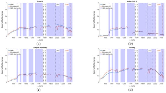 DAY4. Graphical comparison of the spectral reflectance obtained by the LBAC and the PRISMA L2C product for the targets: (a) Sand 1, (b) Holm Oak 2, (c) Airport Runway, and (d) Quarry. The transparent blue patches indicate the water absorption bands. In the figures the CO2 and the CH4 absorption bands are also indicated.