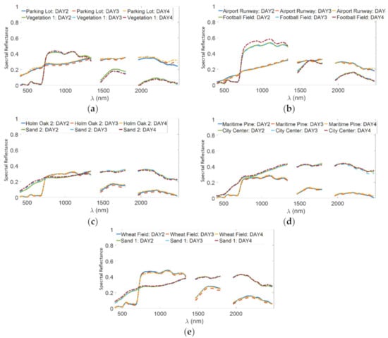 Comparison of the spectra derived by the LBAC on the considered targets in the three images named DAY2, DAY3, and DAY4 (a–e).