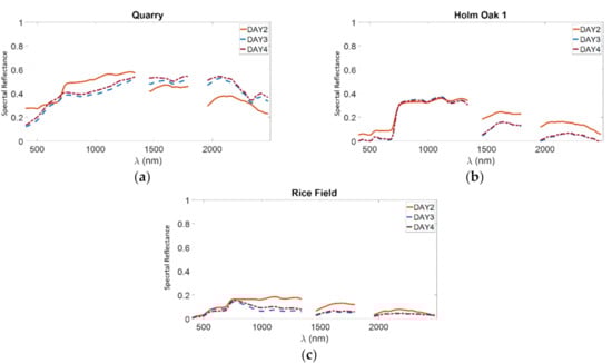 Comparison of the spectra derived by the LBAC on the targets Quarry (a), Holm Oak 1 (b), and Rice Field (c) in the three images named DAY2, DAY3, and DAY4.