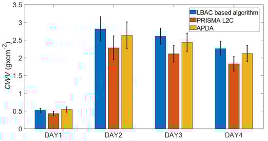 Figure 12 shows, in the form of error bars, the mean values and the standard deviations of the estimates obtained by the means of the LBAC-based procedure, those included in the PRISMA L2C product, and those obtained by APDA. We excluded the estimates from water pixels where the three procedures do not provide reliable results because of the low signal-to-noise ratio in the water absorption bands. In all the considered cases, the proposed algorithm provides values quite close to those included in the PRISMA L2C product and those derived by APDA. Specifically, the LBAC-based procedure attains values of very similar to those provided by APDA. Both the algorithms give estimated values greater than (approximately 20%) those provided by the PRISMA AC algorithm. However, the estimates from the three algorithms are highly correlated. The correlation coefficients between the LBAC and the PRISMA L2C are 0.72 for DAY1, 0.93 for DAY2, 0.89 for DAY3, and 0.91 for DAY4. Those between the LBAC and APDA are 0.73 for DAY1, 0.93 for DAY2, 0.9 for DAY3, and 0.92 for DAY4. The APDA and PRISMA L2C products, both exploiting the differential absorption approach, have correlation coefficients greater than 0.95 in all the considered images. For completeness, in Figure 13 we show the (estimated) probability density functions (pdf) for the values obtained by the three algorithms on the four images. For each image, the pdf of the estimates obtained by the proposed procedure and by the PRISMA L2C product have approximately the same shape, but they seem to differ for a shift. This is especially true for the DAY2, DAY3, and DAY4 images. As for the comparison between the LBAC-based procedure and the APDA, we note that the pdfs are very close in shape and position.
