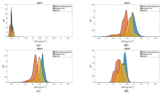 Estimated probability density function (pdf) of the CWV values provided by the LBAC-based procedure and the PRISMA L2C product on: (a) DAY1 image, (b) DAY2 image, (c) DAY3 image, and (d) DAY4 image.