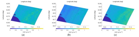 DAY1: (a) CWV map obtained by the proposed procedure; (b) CWV map from the PRISMA L2C product; (c) CWV map obtained by the APDA algorithm.