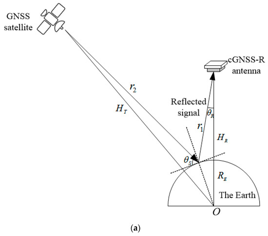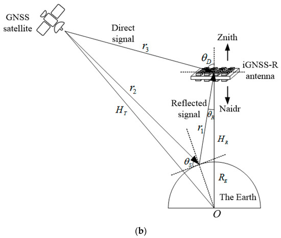The basic structure and geometric relationship of the (a) cGNSS-R system and (b) iGNSS-R system, where indicates the Earth’s core, indicates the elevation angle, indicates the Earth radius, and indicates the orbital height of the transmit and receive antenna, respectively, indicates the distance between the specular point and the GNSS-R antenna, indicates the distance between the GNSS satellite and the specular point, and indicates the distance between the GNSS satellite and the GNSS-R antenna.