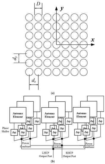 Figure 2 shows the structure of the NDCPPA model adopted by iGNSS-R system, which is composed of multiple antenna elements distributed on a plane, and each antenna element is equipped with a phase shifter to change the phase of the signal fed on it. All the phase shifters are controlled by a beam controller. Therefore, the expected electric field distribution function within antenna aperture can be obtained by changing the phase relationship between antenna elements. As the phase relationship between antenna elements changes, the required antenna radiation pattern and beam orientation is obtained. Each unit of the phased array antenna is fed with equal amplitude, and its adjacent elements are fed with the same phase difference . Therefore, the radiation pattern of the NDCPPA can be expressed as [38]: