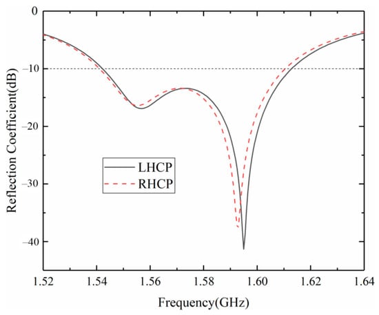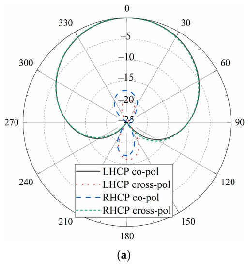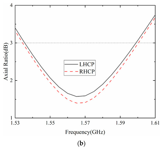 Figure 4 and Figure 5 show the main electrical properties of the NDCPPA model’s element. As shown in Figure 4, in the frequency band from 1.54 to 1.62 GHz, the reflection coefficient of the NDCPPA model’s element was better than −10 dB, which indicates its impedance bandwidth. Figure 5 shows the simulated radiation pattern and axial ratio of the NDCPPA model’s element. The bandwidth of 3 dB axial ratio with the NDCPPA model’s element was 61 MHz (1.54–1.61 GHz). Within this frequency bandwidth, the good impedance matching characteristic and circular polarization characteristic could be achieved. In Figure 4 and Figure 5, LHCP was the performance of the antenna array’s element fed by defined in Figure 3, and RHCP was the performance fed by .