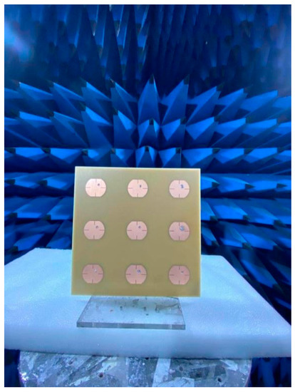 After the design and fabrication, the NDCPPA model verification prototype was realized as shown in Figure 6 and was measured in an anechoic chamber. As mentioned above, the NDCPPA model verification prototype formed LHCP and RHCP beams simultaneously. The patterns of these two beams were the same shape, and the two beam forming networks were independent of each other. Therefore, manufacturing and measuring a mono-polarized beam was sufficient to verify the performance of the NDCPPA model verification prototype. Based on these considerations, this paper verifies the LHCP beam of the NDCPPA model verification prototype. In recent years, due to the wide application of printed antennas in GNSS precision technology [40,41], the cost of equipment in this field has been greatly reduced, and the equipment has been widely spread. The NDCPPA model verification prototype proposed in this paper used the same type of printed antenna; thus, it can also greatly reduce the cost of GNSS-R equipment, thereby speeding up the popularization of GNSS-R equipment.