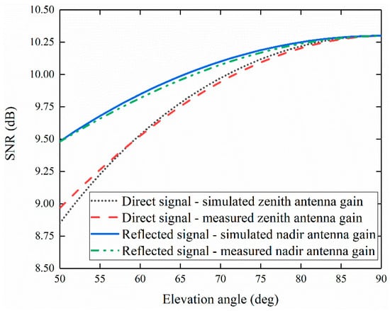 In this study, the observation scenario of the TDS-1 satellite was used to evaluate the SNR of iGNSS-R. Therefore, the system parameters of the iGNSS-R altimeter were as consistent with TDS-1 as possible. The specific parameter settings are shown in Table 3. Figure 9 shows the calculated SNR when the NDCPPA model verification prototype was used as zenith antenna and nadir antenna. When calculating, use the simulated value and measured antenna gain into the simulation environment listed in Table 3 to obtain the comparison of SNR. According to Figure 9, the SNR calculated from the simulated and the measured gain in the simulated environment is in good agreement, and the difference between them is less than 0.1 dB.