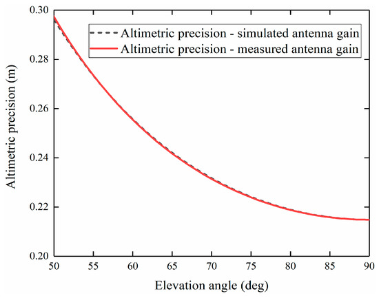 Next, this study evaluated the altimetric precision of the NDCPPA model verification prototype applied in the spaceborne iGNSS-R sea surface altimetry scenario. Figure 10 shows the calculated altimetric precision when the NDCPPA model verification prototype was used as a zenith antenna and nadir antenna. When calculating, use the simulated and measured antenna gain into the simulation environment. According to Figure 10, due to the SNR calculated from the simulated and measured gain brought into the simulated environment in good agreement, the altimetric precision difference between the two situations is less than 0.01 m.