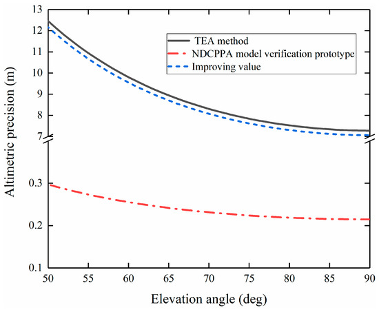 In order to analyze the improvement effect of the NDCPPA model on the precision of iGNSS-R altimetry relative to the TEA method, based on the accuracy model provided in the article [14], the altimetric precision of the TEA method and the NDCPPA model is established: