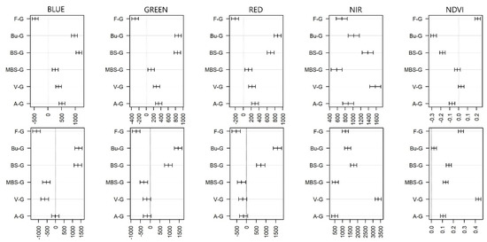 Differences of gullies and other land cover types’ reflectance by bands and seasons (G: gully; F: forest; Bu: built-up; BS: bare soil; MBS: mixed bare soil; V: vegetation; A: agriculture; mean ± 95% confidence intervals; the difference was not significant if confidence range intersects the dashed line).