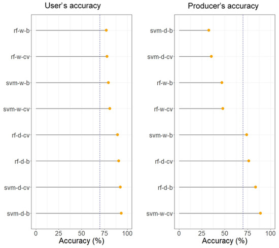 Unbiased user’s accuracy and producer’s accuracy (rf: random forest, svm: support vector machine, w: wet season, d: dry season, cv: cross-validation, b: bootstrapping, blue dashed line is 70% accuracy benchmark).