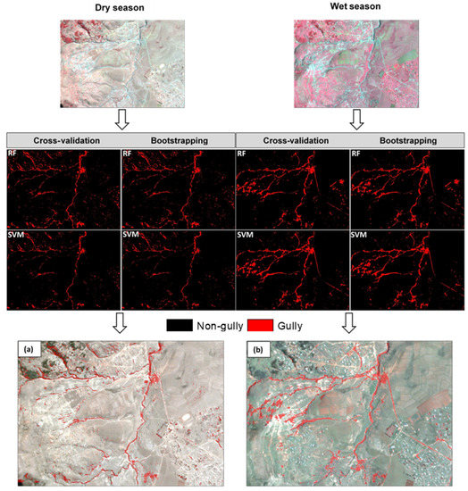 - Generally, based on the OAs, CV performed better with the RF algorithm than the bootstrapping (with ~1.0–1.5% differences), but on a class level, bootstrapping provided the most accurate gully extraction with the RF in the dry season, whereas CV was efficient with SVM in the wet season.