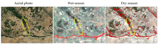 An example of a vegetated gully (dashed yellow ellipse) in the dry and wet seasons.