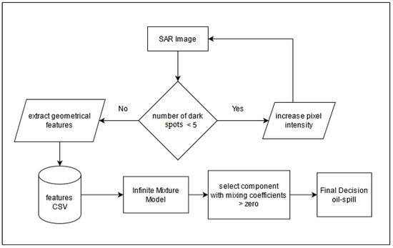 Among the probabilistic generative models, the so-named finite mixtures have been successfully applied due to their capability to represent large-scale complex probability densities and to offer a principled way for analyzing missing data [2,3]. Mixture models provide, in general, a formal approach to unsupervised learning and allow, in particular, to select the optimal number of clusters for a given dataset. This fact has been largely detailed in the literature (see, for example, [4,5]). This growing interest has led to developing several fascinating and flexible mixture models such as Gaussian-based mixture models (GMM) which have became popular even though they are not the most appropriate for fitting complex non-Gaussian shapes [6,7]. To deal with conventional GMM limitations, many other alternatives, such as Gamma (GaMM) mixtures [8,9,10,11], have shown to perform significantly better than GMM [12] thanks to its compact analytical form which is able to cover long-tailed distributions and to approximate data with outliers. Thus, motivated by the flexibility and good performance obtained with Gamma distribution, we will focus here on investigating Gamma-based mixture model for SAR images classification. We are mainly motivated by the excellent results that Gamma mixture has provided, thanks to its flexibility, for SAR images analysis in many applications such as target detection and discrimination, target recognition and surface classification, oil spill detection, noise reduction, etc. [10]. In this paper, we will focus mainly on oil spill detection.