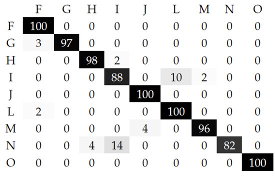 Figure 6 and Figure 7 present the confusion matrices for SAR images classification computed by the proposed InGaMM-eV using the two features extraction methods, respectively. It is noted that these matrices are used to describe the performance of the proposed model since they record true positives, false positives and false negatives. In fact, each matrix summarizes the prediction results on a classification problem and it offers a clear idea of what the proposed model is working correctly and what kinds of errors it commits. Each entry of index represents the number of images in class u that are affected to class v. According to these results, the average classification accuracy is very promising and is equal to 90.57% (error rate of 9%) for the first dataset and 95.16% (error rate of 4%) for the second dataset.