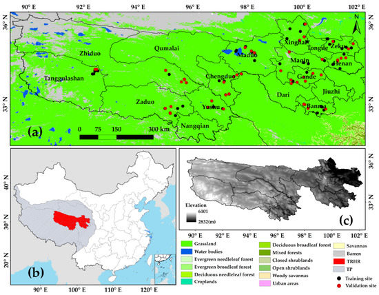 Maps showing the location of the study sites. (a) The distribution of land cover types. The black dots are training sites, and the red dots are validation sites. (b) The location of the Tibetan Plateau (TP) and Three-River Headwaters Region (TRHR) in China. (c) The elevation data of the TRHR. The study area consists of 17 counties and cities delineated by the Ecological Protection and Restoration Program, including Zeku, Tongde, Henan, Xinghai, Maqin, Gande, Jiuzhi, Dari, Banma, Maduo, Chengduo, Yushu, Nangqian, Qumalai, Zaduo, Zhiduo, and Tanggulashan.