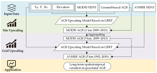 In this study, we upscaled grassland AGB from ground-based points to a 5 km spatial resolution using the MODIS NDVI product with a 1 km spatial resolution as a bridge to generate a long-term (1982–2018) grassland AGB product in the TRHR. We have three major objectives: (1) to upscale AGB from ground observations to a 1 km spatial resolution; (2) to upscale AGB from a 1 km to 5 km spatial resolution; and (3) to estimate long-term (1982–2018) grassland AGB of a 5 km spatial resolution in the TRHR.