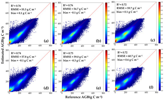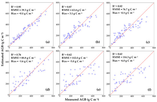 where refers to the number of samples and and refer to the ith reference and estimated AGB, respectively. and refer to the average value of the reference and estimated AGB, respectively.