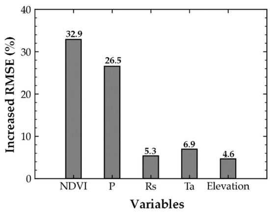 Importance of input variables to AGB upscaling model depicted by increased RMSE percentage, including NDVI, precipitation (P), downward shortwave radiation (Rs), air temperature (Ta), and elevation.