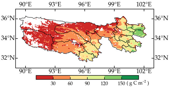 Figure 7 shows the overall spatial patterns of the annual average grassland AGB in the TRHR during 1982–2018. The annual average AGB decreases from the southeast to the northwest. A total of 3.2% of the total area in the grassland of the TRHR with a high AGB distribution (120–180 g C m−2) is mainly located in the far east region of the study area (Zeku, Henan and Jiuzhi). Figure 7 clearly shows a low AGB distribution (0–60 g C m−2), which occupies approximately 72.6% of the northern, western, and central areas of the TRHR (Qumalai, Maduo, Zhiduo, Tanggulashan, Zaduo and Chengduo). The southern and eastern areas of the TRHR (Yushu, Nangqian, Xinghai, Tongde, Maqin, Gande, Dari and Banma) have a relatively moderate AGB of approximately 60–120 g C m−2 covering approximately 24.2% of the study area. The AGB distribution is mostly concentrated at 0–60 g C m−2, and the number of AGB values larger than 100 g C m−2 is relatively low.
