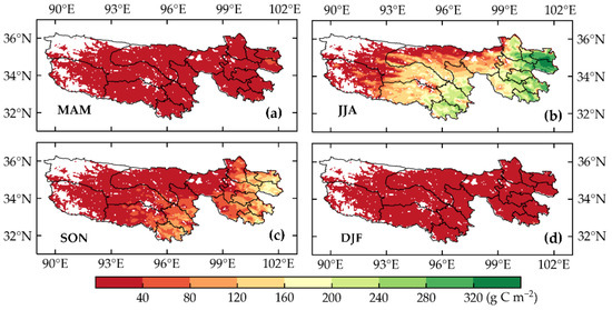Multiyear seasonal spatial patterns of grassland AGB in the TRHR. (a) MAM (March, April, and May); (b) JJA (June, July, and August); (c) SON (September, October, and November); (d) DJF (December, January, and February).