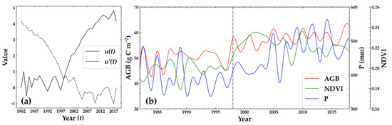Figure 9 presents the turning point of AGB temporal variation was found in 1998 by the sequential Mann–Kendall test and the interannual variation in AGB, P, and NDVI over the period of 1982–2018. The annual AGB, P and NDVI in the TRHR increased over 1982–2018 with a linear fit with slopes of 0.37 g C m−2 year−1, 3.66 mm year−1, and 0.9 × 10−3 year−1, respectively (p < 0.05). An increase in annual AGB and NDVI occurred during 1982–1998, with linear trends of 0.16 g C m−2 and 0.30 × 10−3 year−1 (p < 0.05). Such an increase in the annual AGB is consistent with the NDVI increase in response to global warming. Coincident with the El Niño event in 1998, the positive trend in AGB seems to have accelerated (0.21 g C m−2 year−1, p < 0.05) during 1998–2018. The time slope of P was found to have changed from being negative (−2.81 mm year−1, p < 0.05) during 1982–1998 to positive (5.02 mm year−1, p < 0.05) during 1998–2018. However, since 1998, the increase in the annual NDVI seems to have stalled, with a 95% confidence interval trend of −0.50 × 10−3 year−1 (p < 0.05).