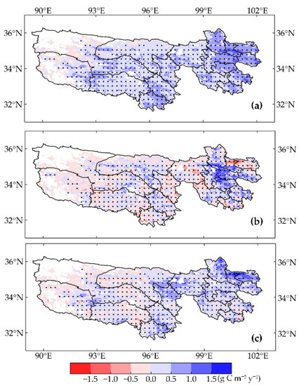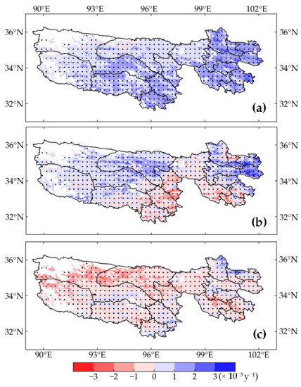 Spatial pattern of NDVI trends from (a) 1982–2018, (b) 1982–1998, and (c) 1998–2018 in the TRHR. The black solid dots refer to grids with 95% confidence.