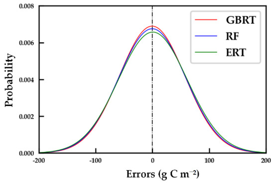 We compared estimated AGB errors to judge the performance of GBRT, RF, and ERT. Figure 13 illustrates the probability density distributions of the AVHRR-derived estimated AGB errors against the MODIS-derived reference AGB with a 5 km spatial resolution by the GBRT and the other two AGB upscaling models in the validation set. Figure 13 shows that all three predictive errors are closely centered on zero, even in the ERT model, which obtained the largest bias (0.6 g C m−2) (Figure 4f). The GBRT model shows a competitive and superior predictive performance compared to RF and ERT. This may be because the GBRT algorithm has the advantage of producing competitive, highly robust, interpretable procedures for regression [64]. Therefore, the GBRT algorithm can capture the AGB variance accurately and show the optimal estimation performance.