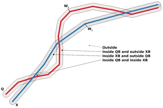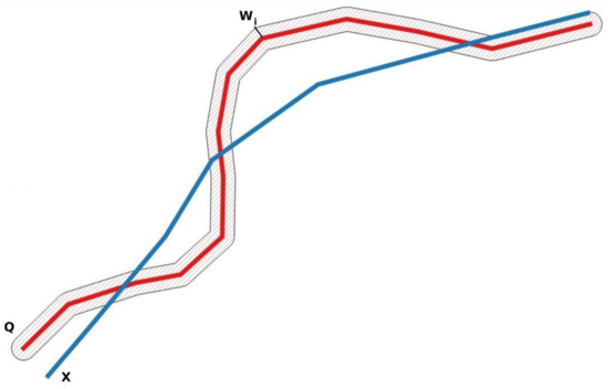 Continuing with the two linear elements, Q (reference) and X (element to analyze), presented previously, the DBM consists of generating incremental buffers of semi-width wi around (both sides) of the Q and X lines. Figure 2 presents a graphical excerpt. In this case, the proposal by [13] is to count several measures that evolve with wi. Being AX(wi) the area of the buffer over X for the width wi, and AQ(wi) the area of the buffer over Q for the same width, these measurements correspond to the following areas: , , , and, based on them, establish an average displacement and the possibility of counting the number of oscillations. The last determination is linked to the possibility of analyzing the randomness of the lateral displacements of X with respect to Q. The parameter w will take values from approximately zero to that which allows the total length of X and Q to be included in the buffer. The method can be applied to a pair X, Q of lines, as explained, or to a set of lines Qj and Xj, obtaining an aggregate result of all of them for each wi. As a result, a curve with characteristics of the observed distribution function is obtained.
