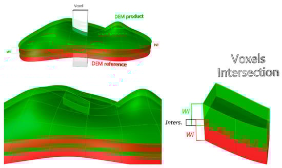 The same assumption as in Section 2.1 has to be considered for the DBM with respect to the planimetric uncertainty component. Furthermore, the method described in the previous paragraph should be slightly adapted for its application to the case of grid-type DEM (Figure 3). Considering that S1 acts as a reference and S2 as a product, we proceed to establish the incremental buffering on the two surfaces. For the analysis with grid-type data, it is convenient to introduce the concept of voxel specified for this context. A voxel is a volume that has as its central section a cell of the grid-type DEM on whose elevation we work, and a height wi on each side (above and below) of that cell. When working with two surfaces S1 and S2 for each position two voxels are considered, one for S1 and another for S2, and we must pay attention to the following situations:
