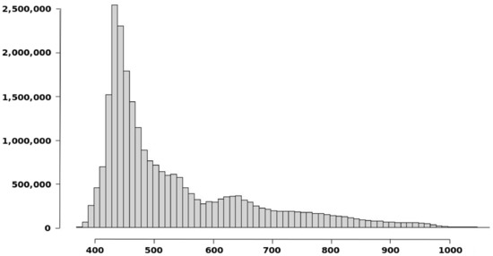 Both DEM data sets come from the Instituto Geográfico Nacional (IGN, Spain, www.igne.es, accessed on 28 July 2021) and are freely available, and have the same spatial reference system ETRS89 UTM Zone 30N with the following coordinates 577,845 m, 4,715,566 m. In relation to the study area, Figure 4 shows a general vision and Figure 5 the corresponding histogram for the elevations. In both figures, the data correspond to the DEM02 data set, (the data corresponding to the DEM05 data set are not presented since visual differences would not be appreciated at this scale of representation). The study area covers 100 km2, and it has a varied relief, but not abrupt, with valleys of different widths, and areas with different degrees of undulation. In order to dispose of some terrain morphological variability, the study area includes a small mountain (Montejurra) and a valley created by the Ega river The elevation is in the interval 354–1047 m, mean value of elevation is 513.66 m and the standard deviation of the elevation is 127.93 m.