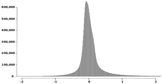 The discrepancies (or vertical errors) between both DEM data sets can be observed in Figure 6 and the histogram in Figure 7, which is presented for the interval [−2, 2] where the majority of values are included. Usually, the values assumed for the discrepancies between a product and a reference must be close to zero, but in this case, it is observed (Figure 6) that discrepancies are in the interval [–55.39, 10.81] m, which means the presence of extreme values (outliers). The position of some of these outliers is highlighted with a red circle in Figure 6. The mean value of the discrepancies is μ = −0.0347 m and the standard deviation σ = 0.6414 m.