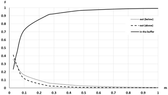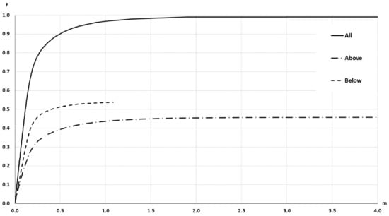 Applying the procedure indicated in Section 2.1, the result shown in Figure 8 can be obtained. This curve has a very long tail until it reaches the extreme value (55.39 m), but to facilitate visual interpretation, only the interval [0, 4] is presented. This curve represents the distribution function of the area of S2 included inside a buffer with wi. S1 is buffered on both sides and results are presented for above, below and the general case (above + below). These curves allow us: